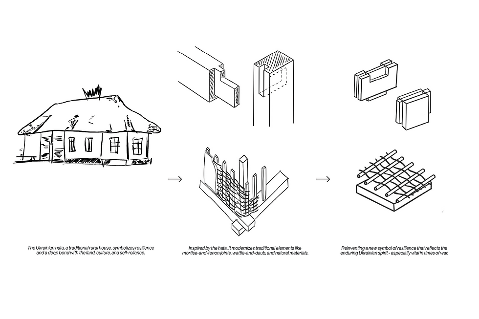 This modular system blends the resilience of the traditional Ukrainian Hata with modern construction technology. Designed for rapid transport, assembly, and integration into damaged or intact buildings, it enhances structural stability, thermal performance, and sustainability.